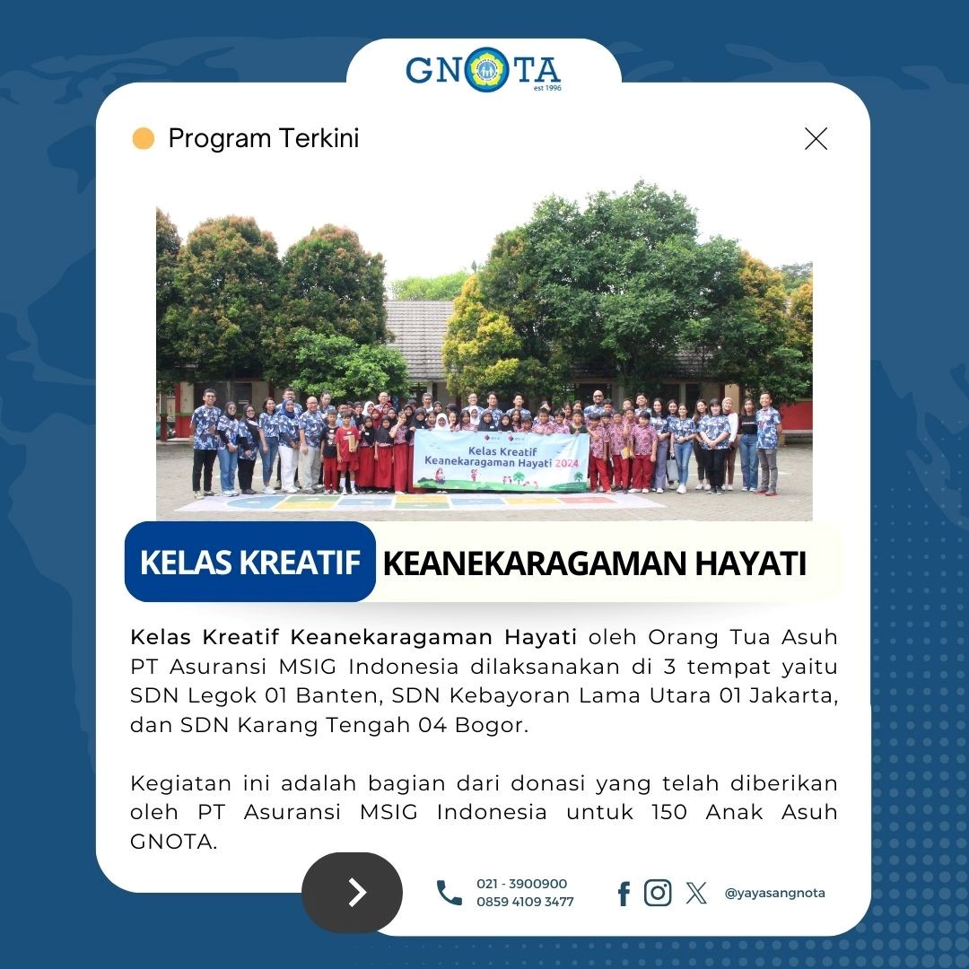 MSIG Indonesia dan MSIG Life, sebagai orang tua asuh, bekerja sama dengan Yayasan GNOTA menyelenggarakan program edukasi lingkungan bertajuk “Biodiversity Fun Class” di beberapa sekolah dasar. Kegiatan ini bertujuan untuk meningkatkan kesadaran lingkungan di anak-anak sekolah. MSIG Indonesia dan MSIG Life merupakan perusahaan yang peduli dengan keberlanjutan berkomitmen untuk berpartisipasi dalam upaya menahan laju perubahan iklim dengan memberikan perhatian untuk melestarikan dan melindungi keanekaragaman hayati. Salah satu bentuk dari kepedulian tersebut adalah dengan mengadakan kelas Biodiversity Fun Class bersama anak-anak asuh dengan harapan meningkatkan kesadaran anak-anak asuh untuk lebih peduli lingkungan.